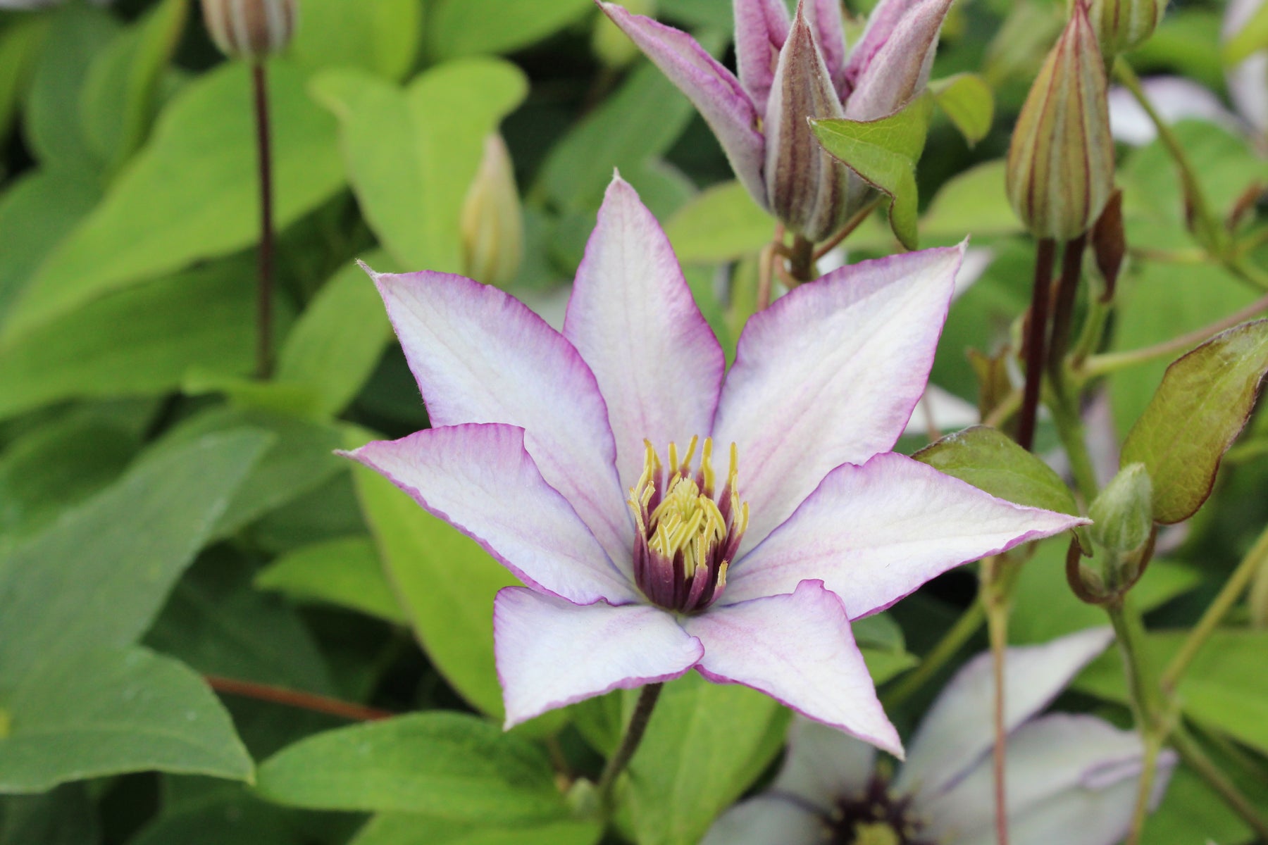A striking compact clematis with shimmering silver-pink flowers edged in mauve, flowering freely all summer.