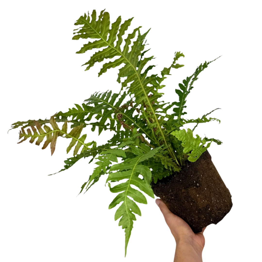 This eye-catching evergreen fern is best known for its spectacular bronze-red new fronds, which emerge in spring and summer like glowing flames before maturing into glossy deep green. With its strong upright rosette and architectural shape, it adds instant impact to woodland borders, shaded patios and underplanting schemes.