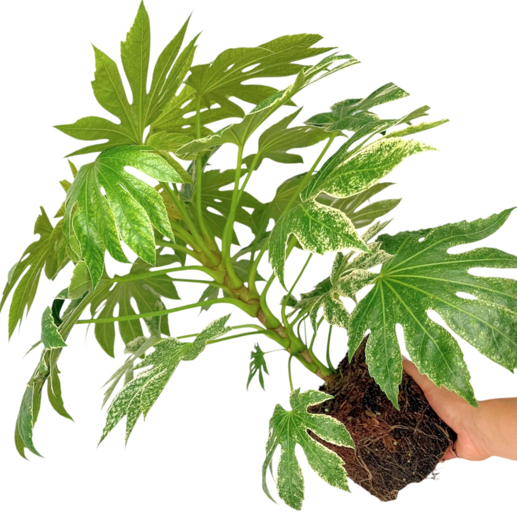Add a touch of frosted elegance to your garden with the stunning Fatsia Japonica 'Spider's Web'. This unique variety of the classic 'Japanese Aralia' is prized for its extraordinary variegated foliage. Each large, palm-like leaf is heavily speckled and splashed with creamy-white markings, giving it a beautiful "frosted" or web-like appearance.