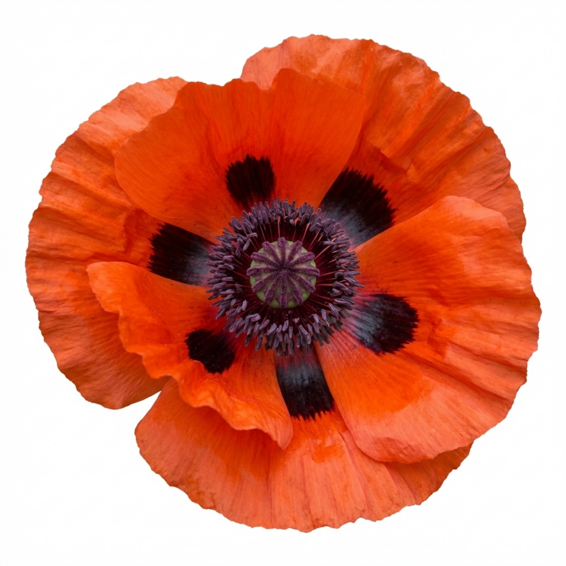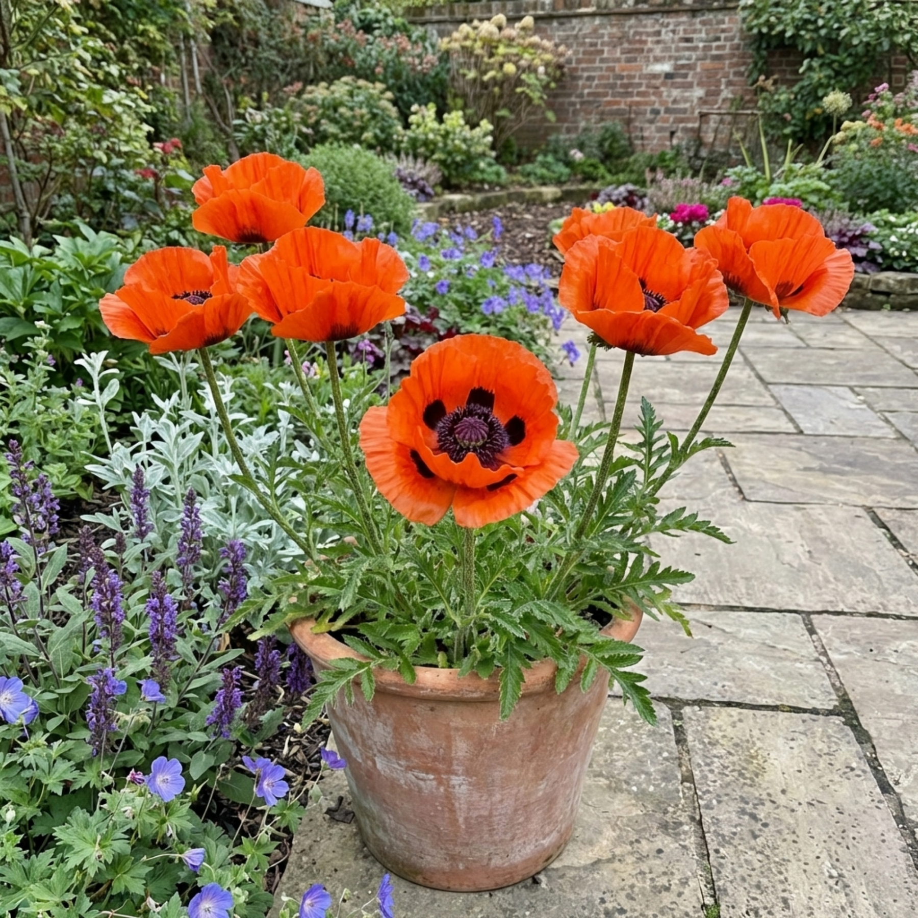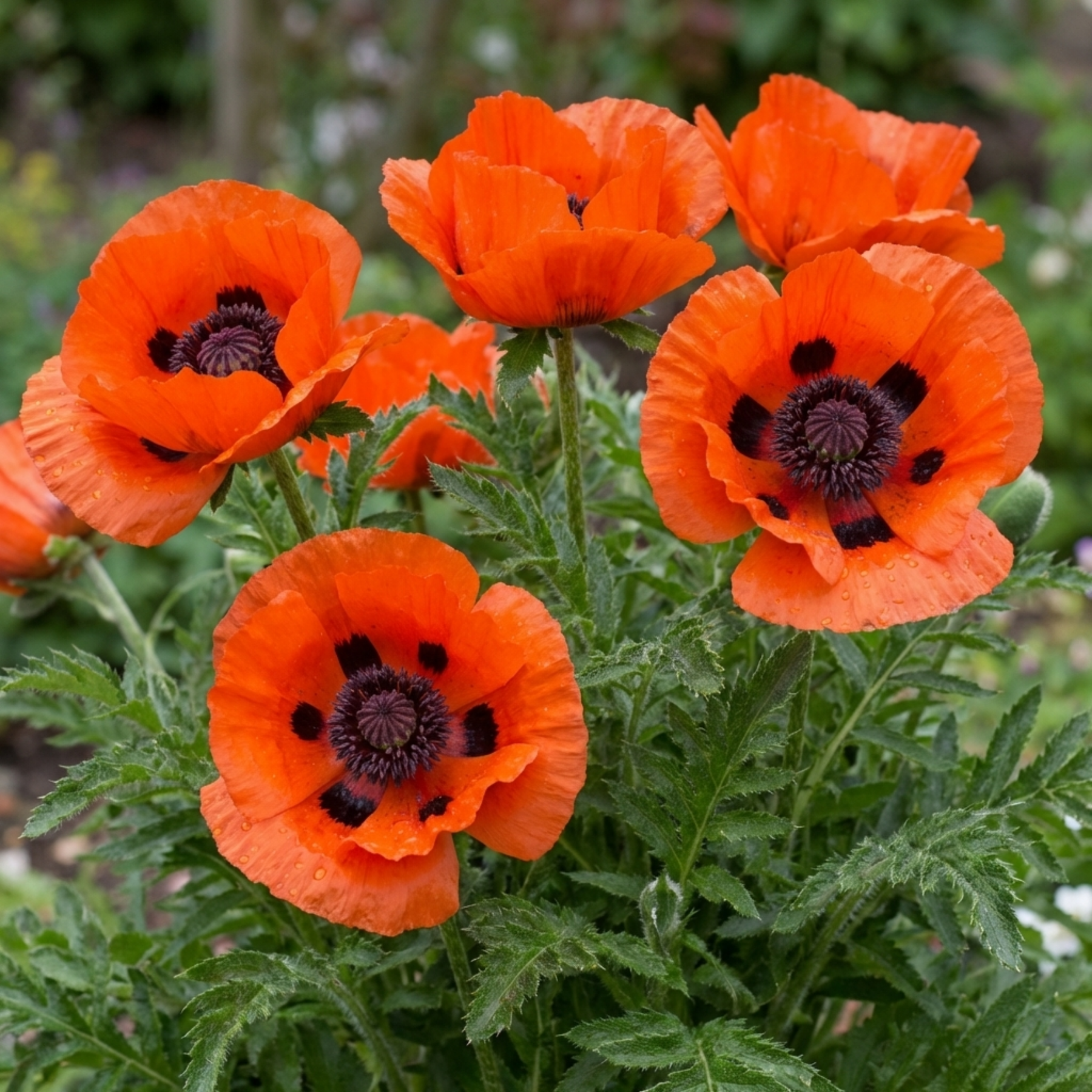 A high-impact Oriental Poppy with massive, glowing orange-scarlet blooms and dramatic black centres.