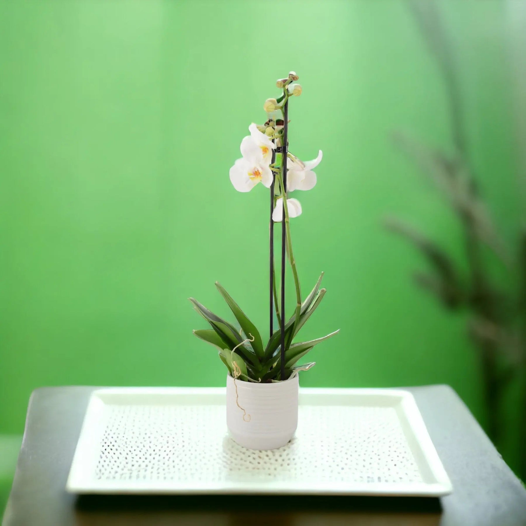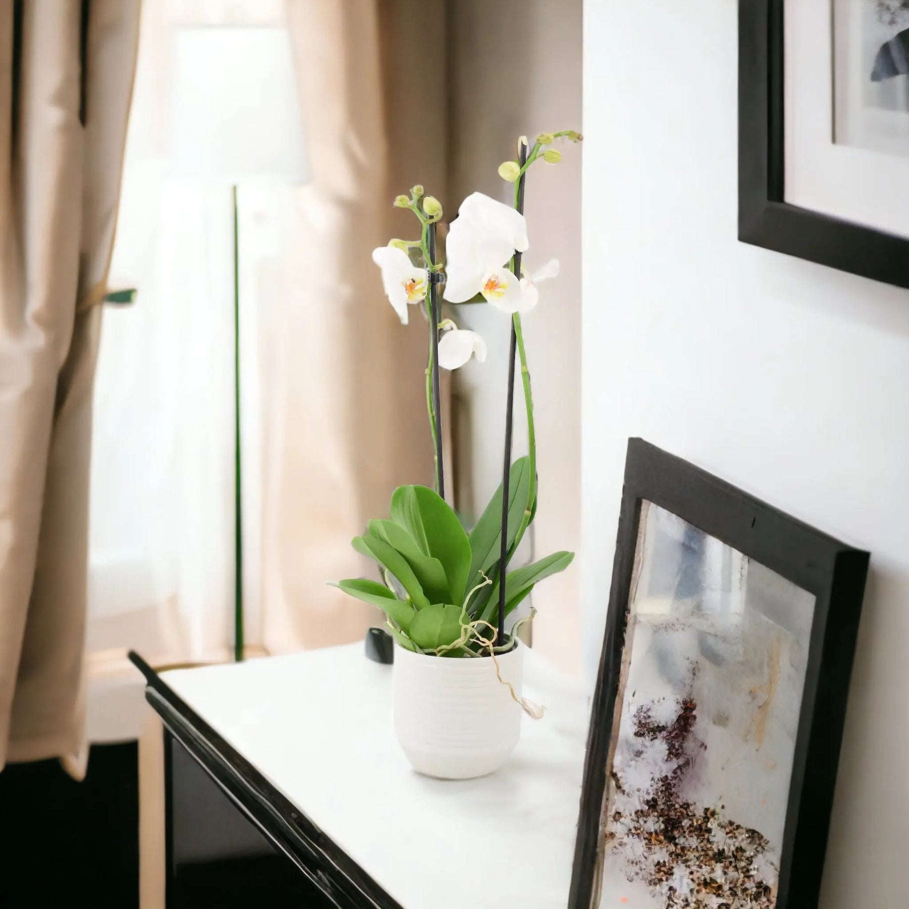 Elevate your interior sanctuary with the ethereal beauty of our Double Stem White Phalaenopsis Orchid. This exquisite specimen is a masterclass in horticultural artistry, featuring two elegant stems specially trained into a sophisticated "halo" shape. Adorned with large, pristine white blooms that resemble delicate moths in flight, it radiates a sense of tranquility and timeless luxury. Perfectly presented in a stylish white decorative ceramic pot, it offers an instant, professional-grade focal point that complements both modern minimalism and classic cottage aesthetics.