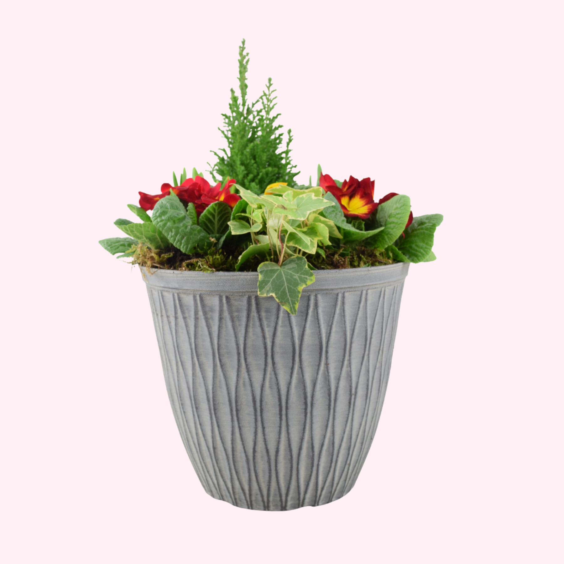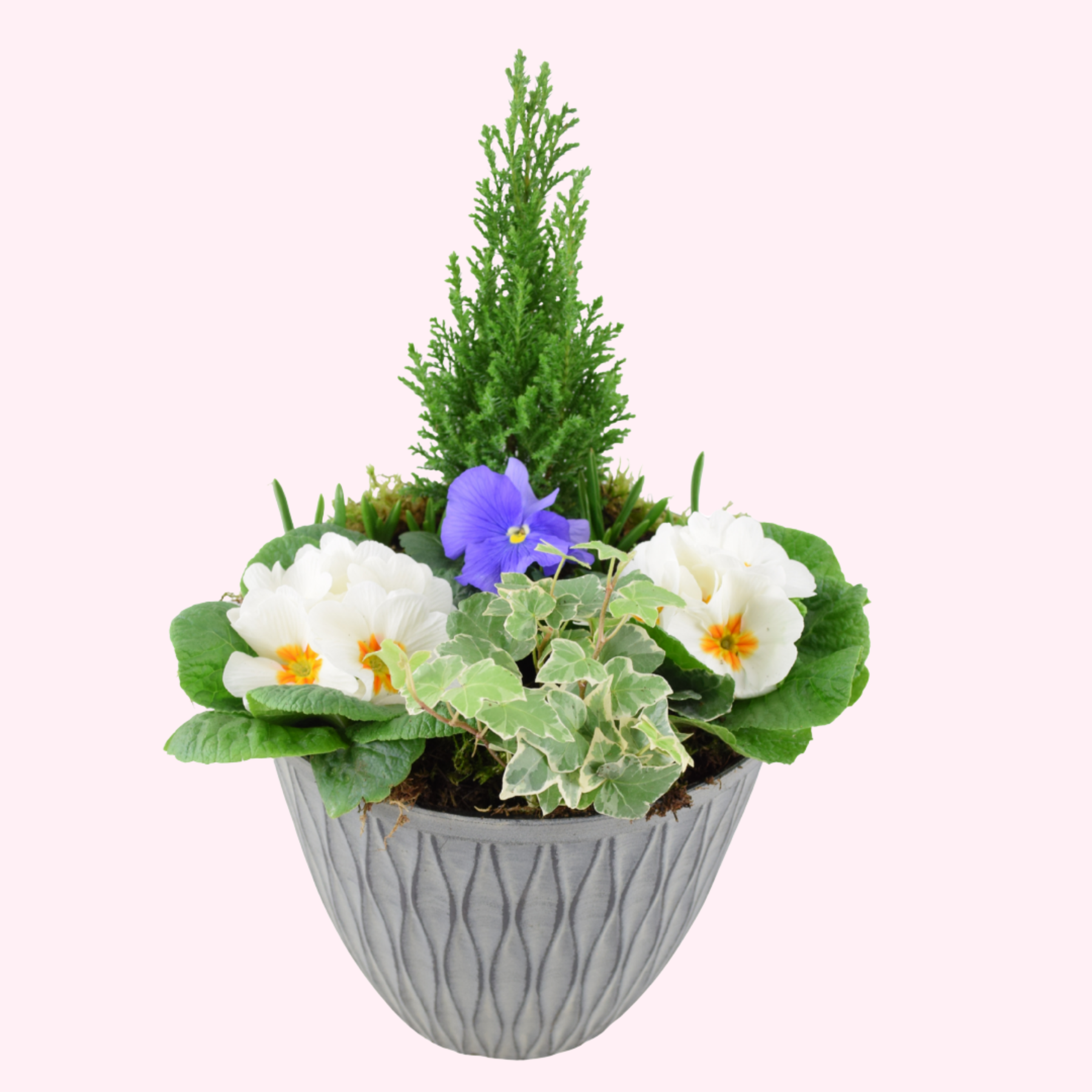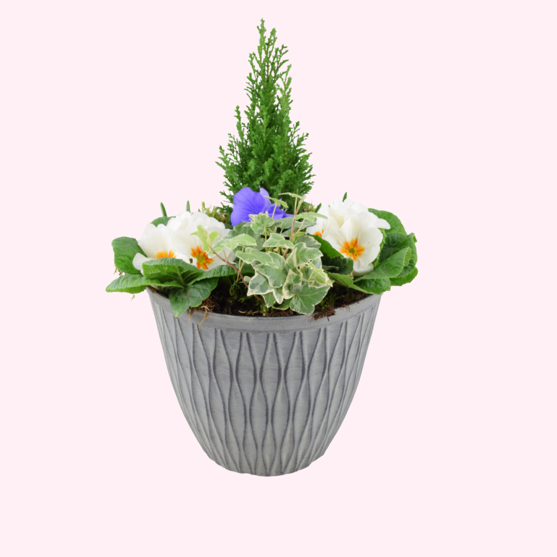 Plant Mix: Seasonal bedding plants (such as Pansies, Violas, Primulas) with trailing ivy or foliage. Plant selection may vary based on seasonal availability.