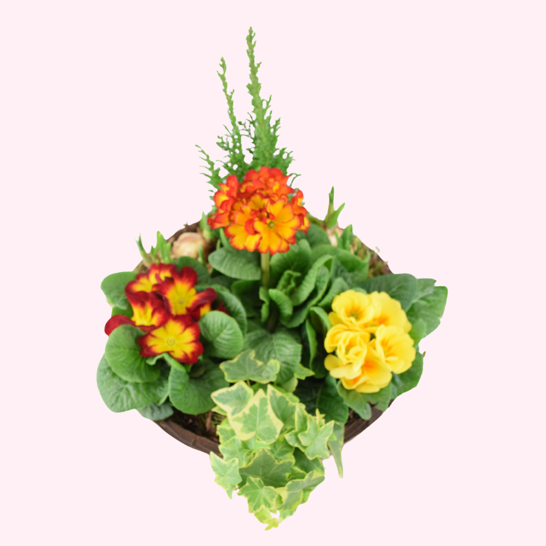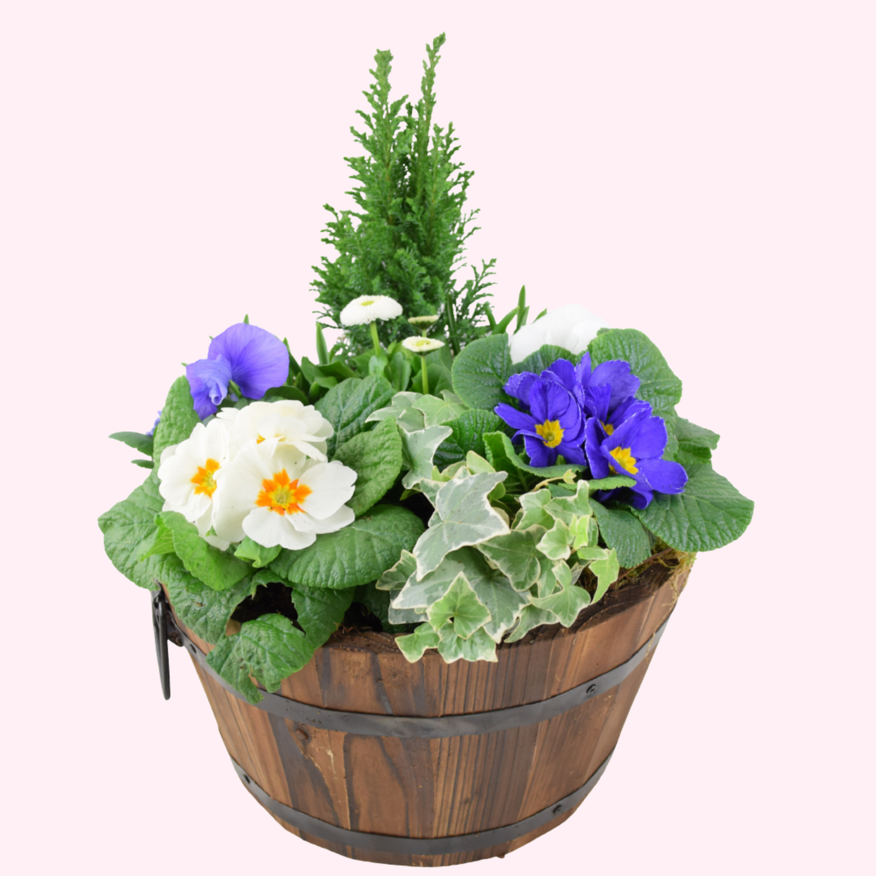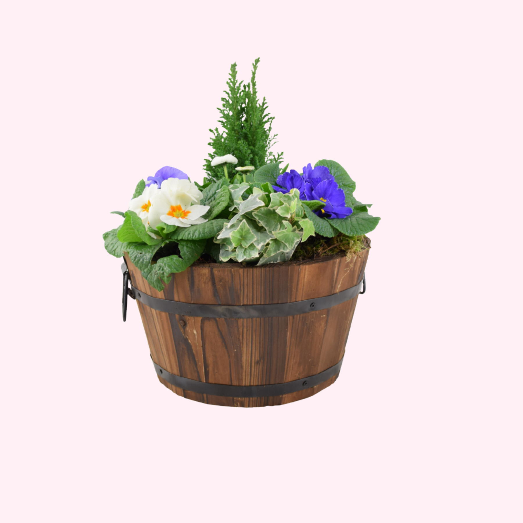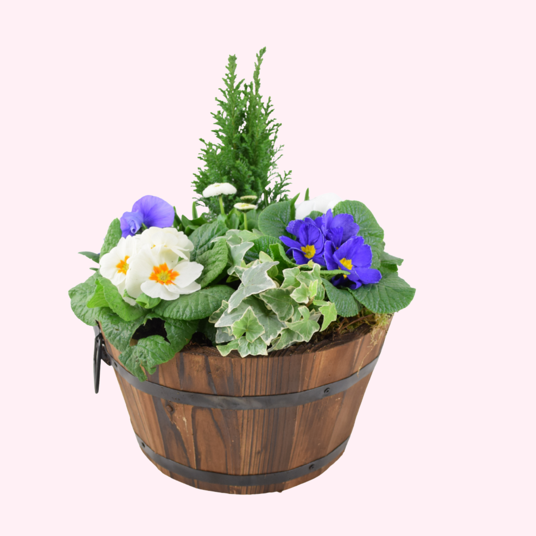Add rustic charm and vibrant seasonal colour to your garden, patio, balcony, or doorstep with our 30cm Seasonal Planted Wooden Barrel. Hand-planted with a lively spring mix of Primulas (Polyanthus), trailing Ivy, and a decorative Conifer for structure, this planter offers an instant garden upgrade.