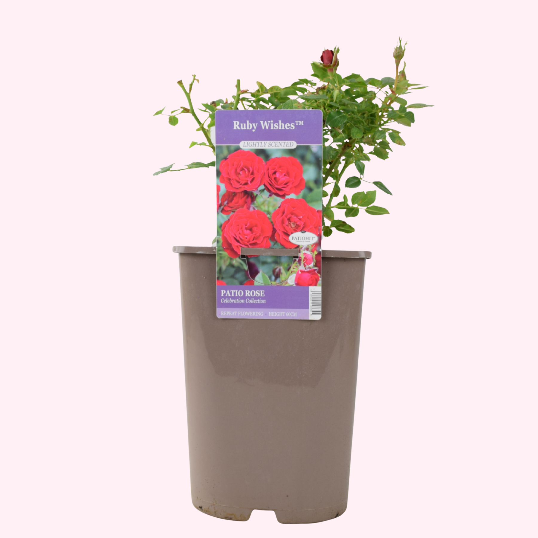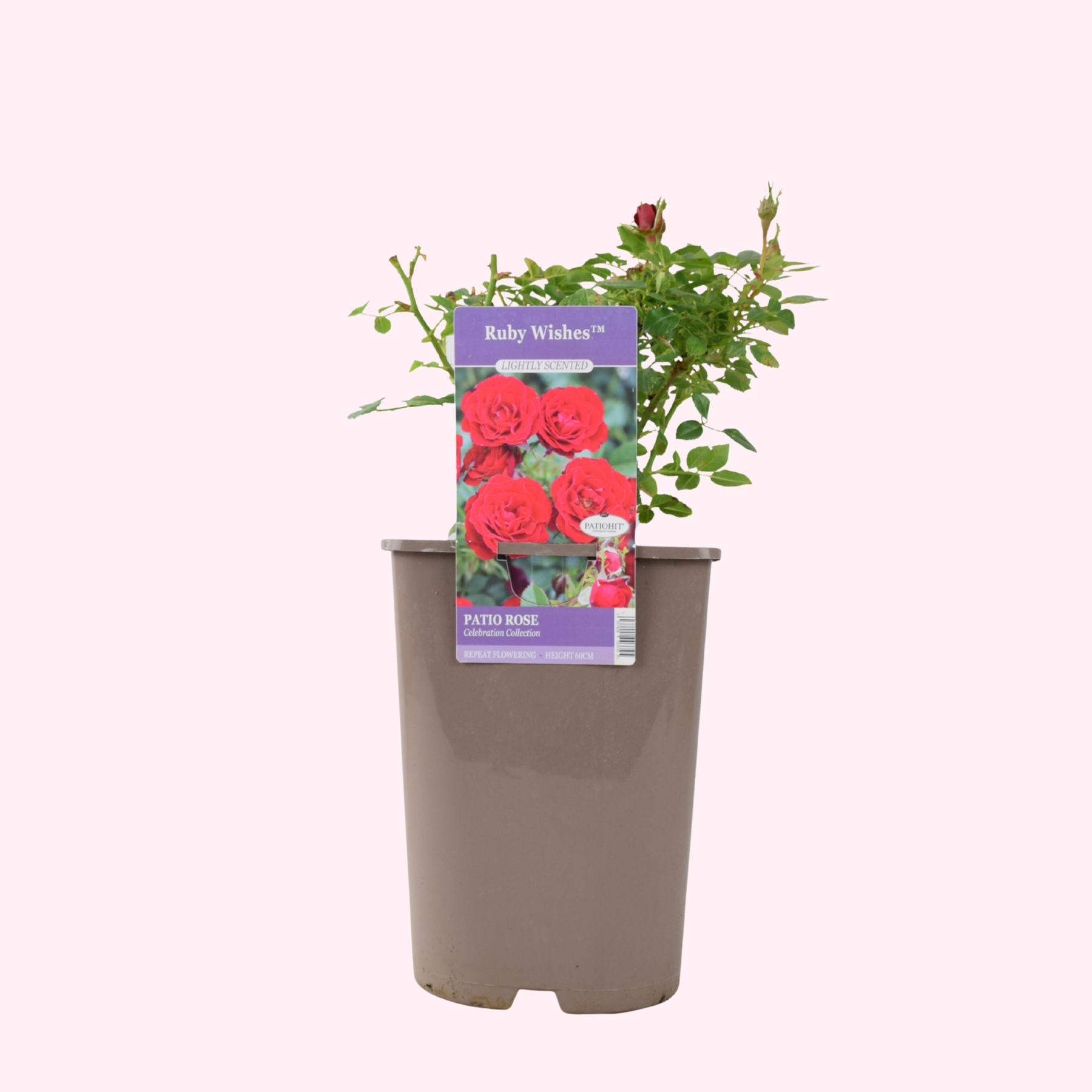 Add a splash of romance and vibrant intensity to your sanctuary with our Rose ‘Ruby Wishes’. This charming patio rose is a true masterpiece of seasonal colour, producing abundant clusters of small, deep ruby-red, semi-double flowers. Its neat and mounded habit makes it an exceptional choice for bringing life to smaller gardens, urban balconies, or as a sophisticated foreground to mixed borders. The velvety petals create a rich, jewel-toned display that repeats reliably from early summer right through to the first autumn frosts.